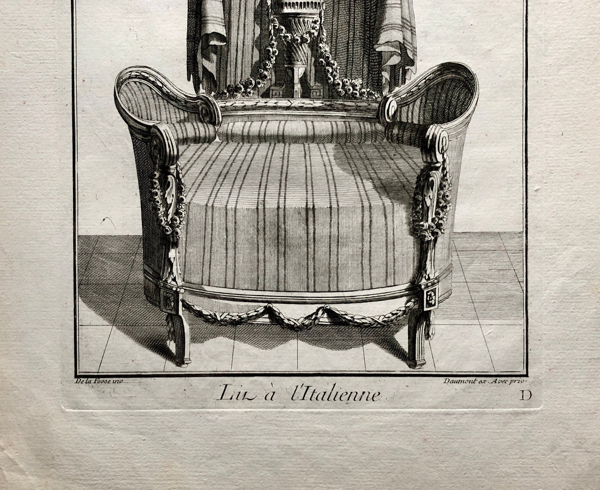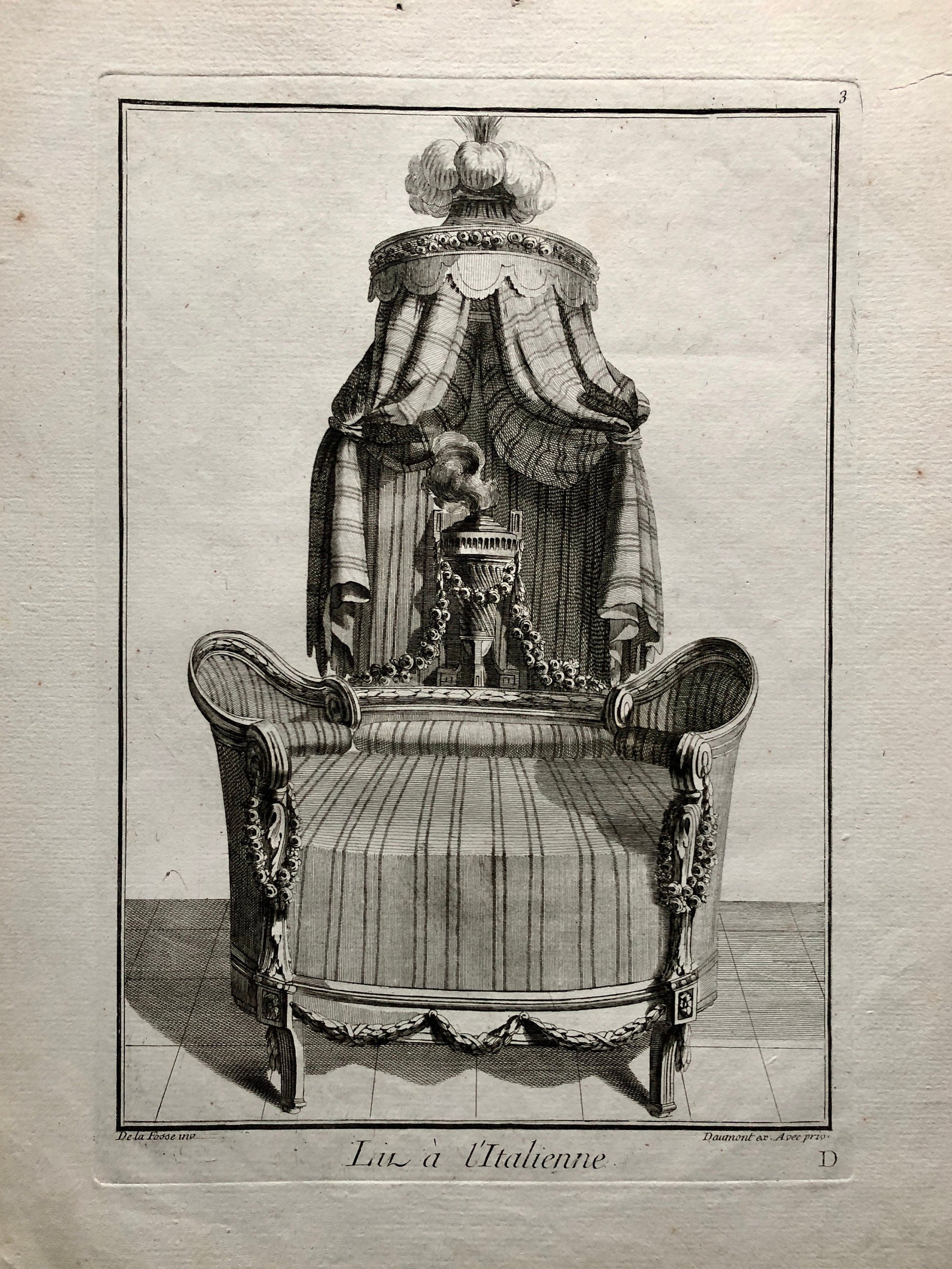 Lit a l’Italienne. A Copper plate Etching from Ameublement by Jean de la Fosse. Circa 1771. Size: 46 x 31 cms.